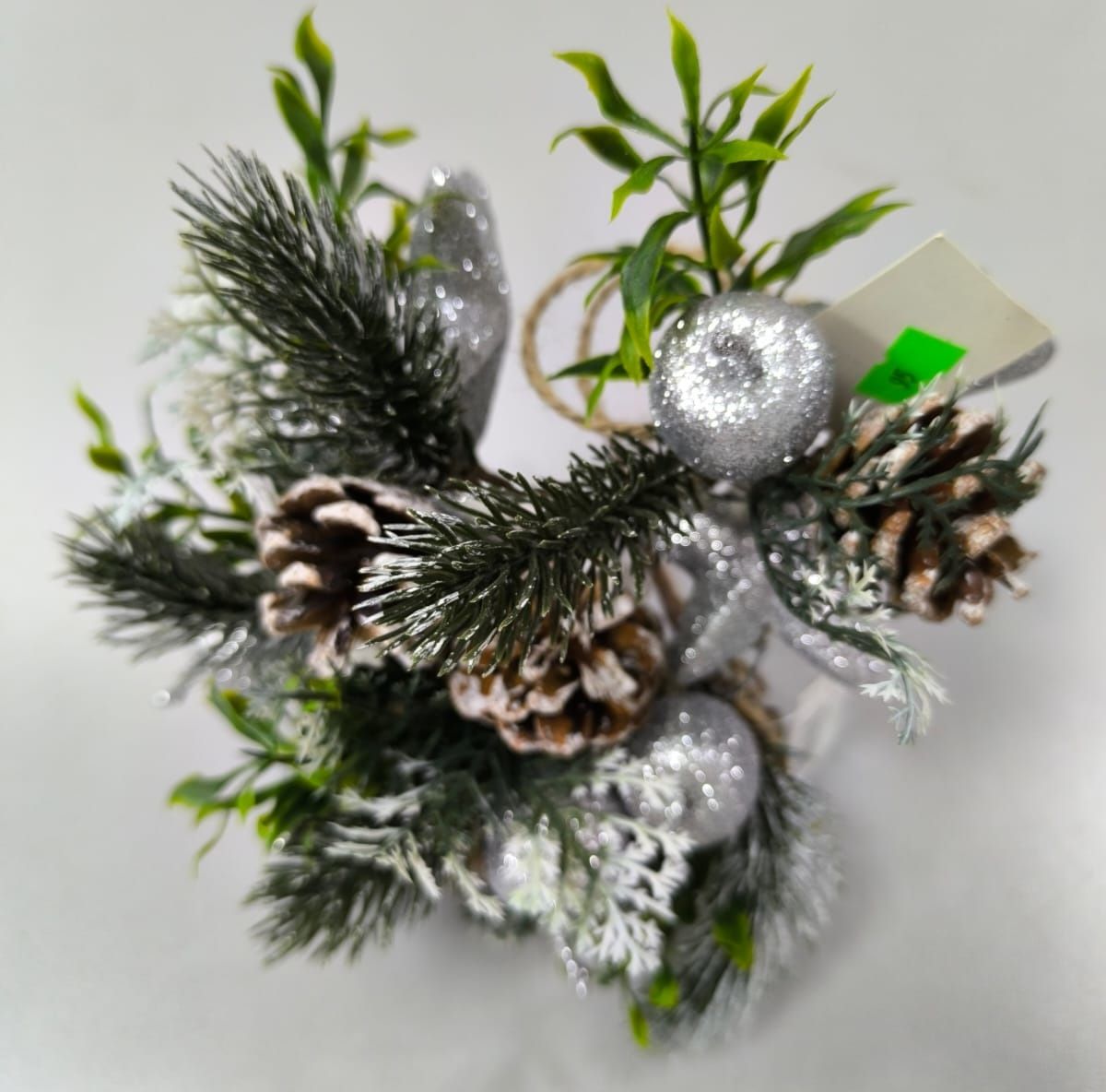 Новогодний букет (ель, шишки, серебряные игрушки)
